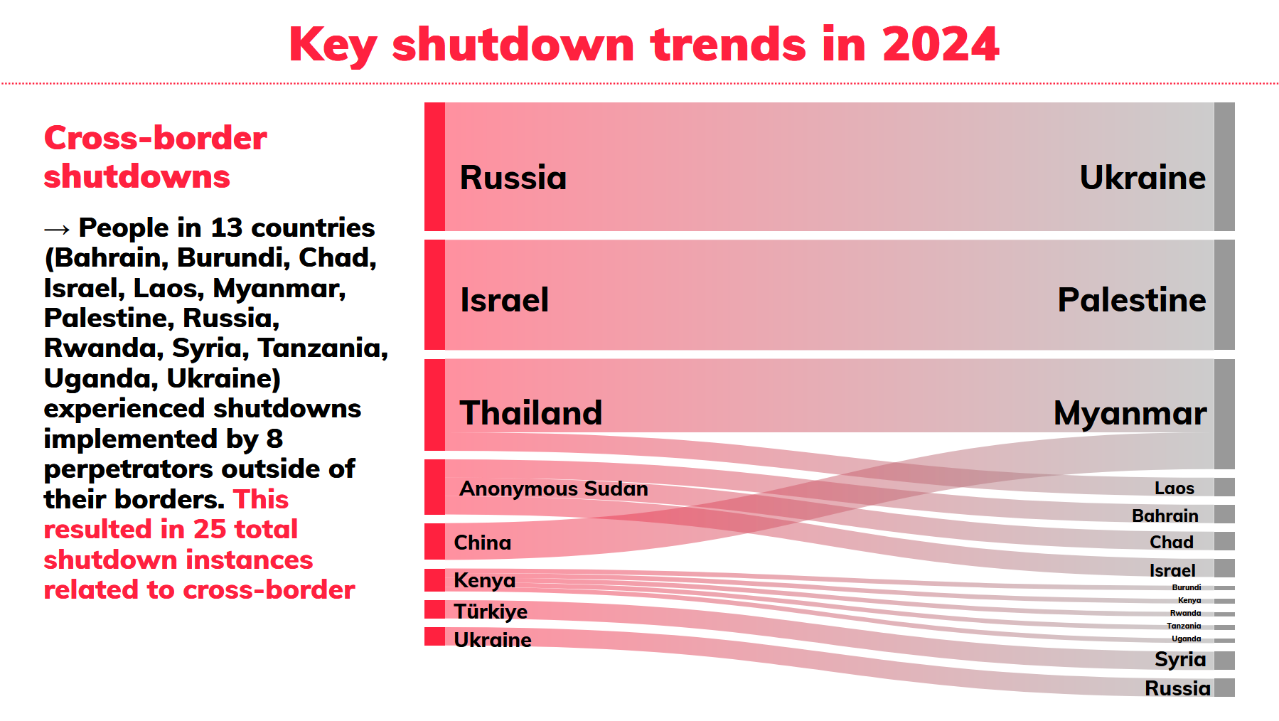 Parallèlement, la coalition a remarqué une augmentation « alarmante » des coupures transfrontalières en 2024, avec 25 coupures de ce type mises en œuvre par huit gouvernements, touchant des personnes dans 13 pays.