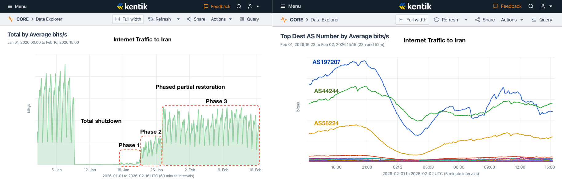 Iran 🇮🇷 L’internet reste limité en Iran après une restauration partielle, indique Doug Madory, responsable de l’analyse internet chez Kentik. “Depuis le 27 janvier, le volume de trafic internet en Iran atteint seulement 58% de son niveau d’avant la coupure du 8 janvier, a-t-il écrit sur Bluesky le 16 février. Au cours de la journée, les courbes de trafic présentent des variations erratiques, signe de déconnexions intermittentes.”