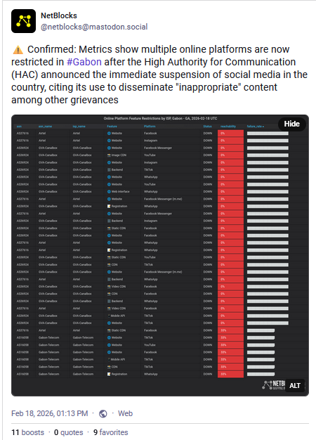 Gabon 🇬🇦 Plusieurs plateformes de réseaux sociaux ont été bloquées dans le pays le 18 février sur demande de la Haute Autorité de la communication (HAC) - et ce “jusqu’à nouvel ordre” - après des manifestations à travers le pays. Facebook, Instagram, TikTok, WhatsApp et YouTube seraient concernés, bien que certains utilisateurs semblent toujours avoir accès à la messagerie instantanée de Meta.