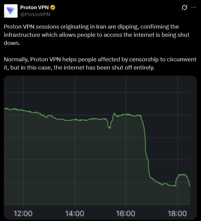 Malheureusement, les VPN, qui nécessitent une connexion pour fonctionner, n’offrent pas de solution lors d’un tel blackout. Proton VPN a d’ailleurs signalé une baisse significative de son trafic en provenance d’Iran depuis le début de la coupure.