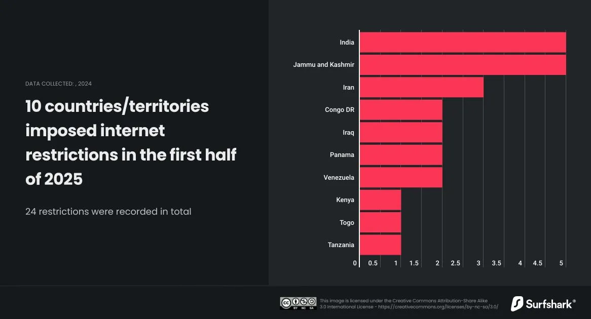 🇮🇳📴 L’Inde continue d’être en tête des pays où l'on restreint le plus internet. D’après une étude du VPN Surfshark, 10 pays ont eu recours à des coupures internet en 2025. L’entreprise a compté 24 coupures en tout dans cette première partie de l’année - un total en hausse par rapport à cette même période en 2024.