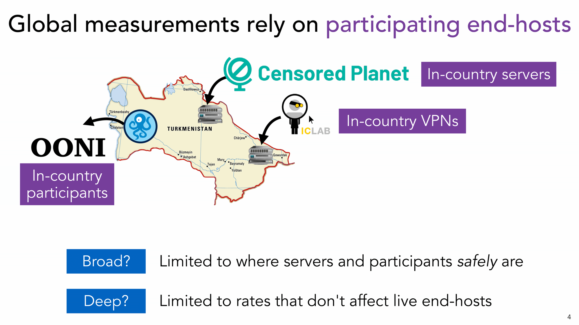 Malheureusement, pratiquement toutes les techniques de mesure nécessitent un certain degré de participation dans le pays ciblé. C’est-à-dire que les chercheurs s’appuient soit sur des appareils ou des serveurs qui sont localisés dans le pays cible, soit sur des volontaires qui enrichissent les outils de mesure depuis le pays cible.