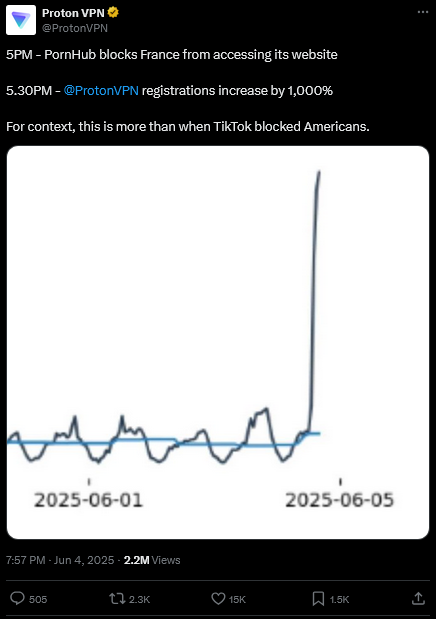 En Europe et au Royaume-Uni, cette tendance de fond est notamment due aux restrictions d’accès à certains contenus pour adultes. Par exemple, en juin 2025, ProtonVPN a noté une hausse de 1000% des inscriptions seulement quelques minutes après le blocage des sites pornographiques du groupe Aylo.